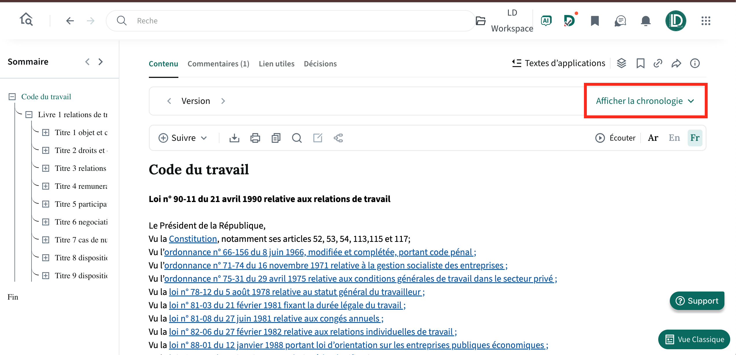 L’accès à la chronologie des textes sur Legal Doctrine se fait directement depuis un texte :