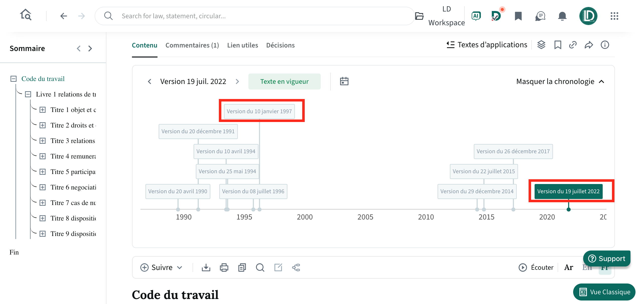 Sur la plateforme Legal Doctrine, la chronologie d’un texte est présentée sous la forme d’un axe temporel interactif, permettant de visualiser :